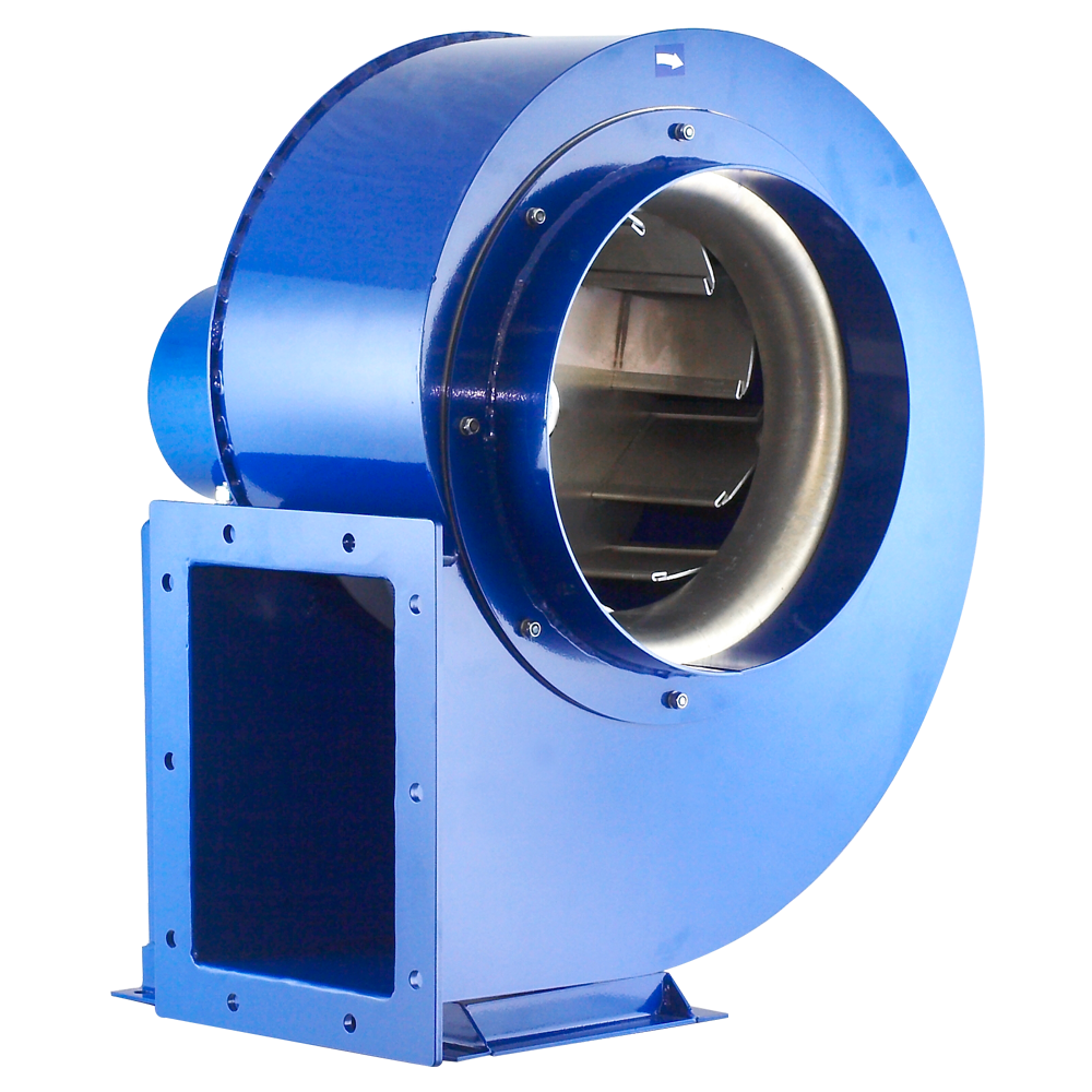 Direktgetriebener Industrie-Radialventilator. Gehäuse in verstärkter Stahlausführung. Laufrad mit Rückwärtsgekrümmten Schaufeln aus Stahl Alle Oberflächen lackiert oder beschichtet in RAL 5010 / Korrosionsschutzklasse C3
